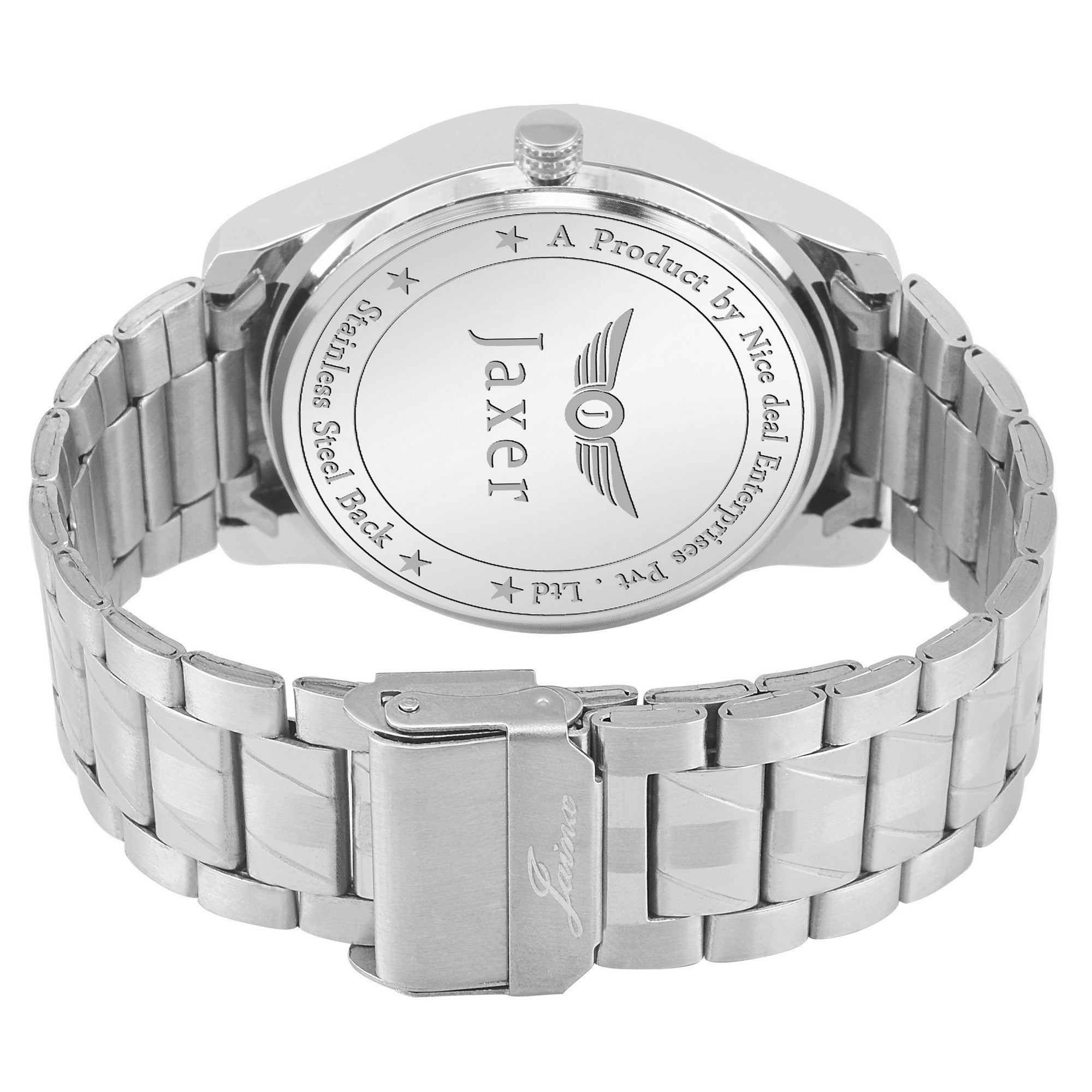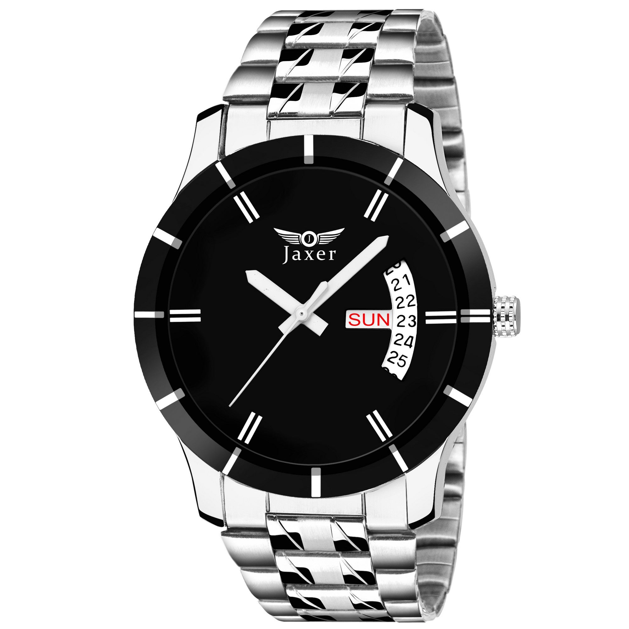 - Wrist Watch: Dial Color - Black, Chain Color - Silver, Case Color - Silver, Feature - Day & Date